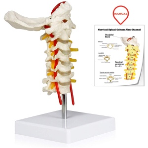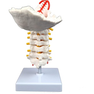Model consists of seven cervical vertebrae, occipital plate, intervertebral discs, cervical nerves, vertebral arteries, and spinal cord for detailed examination