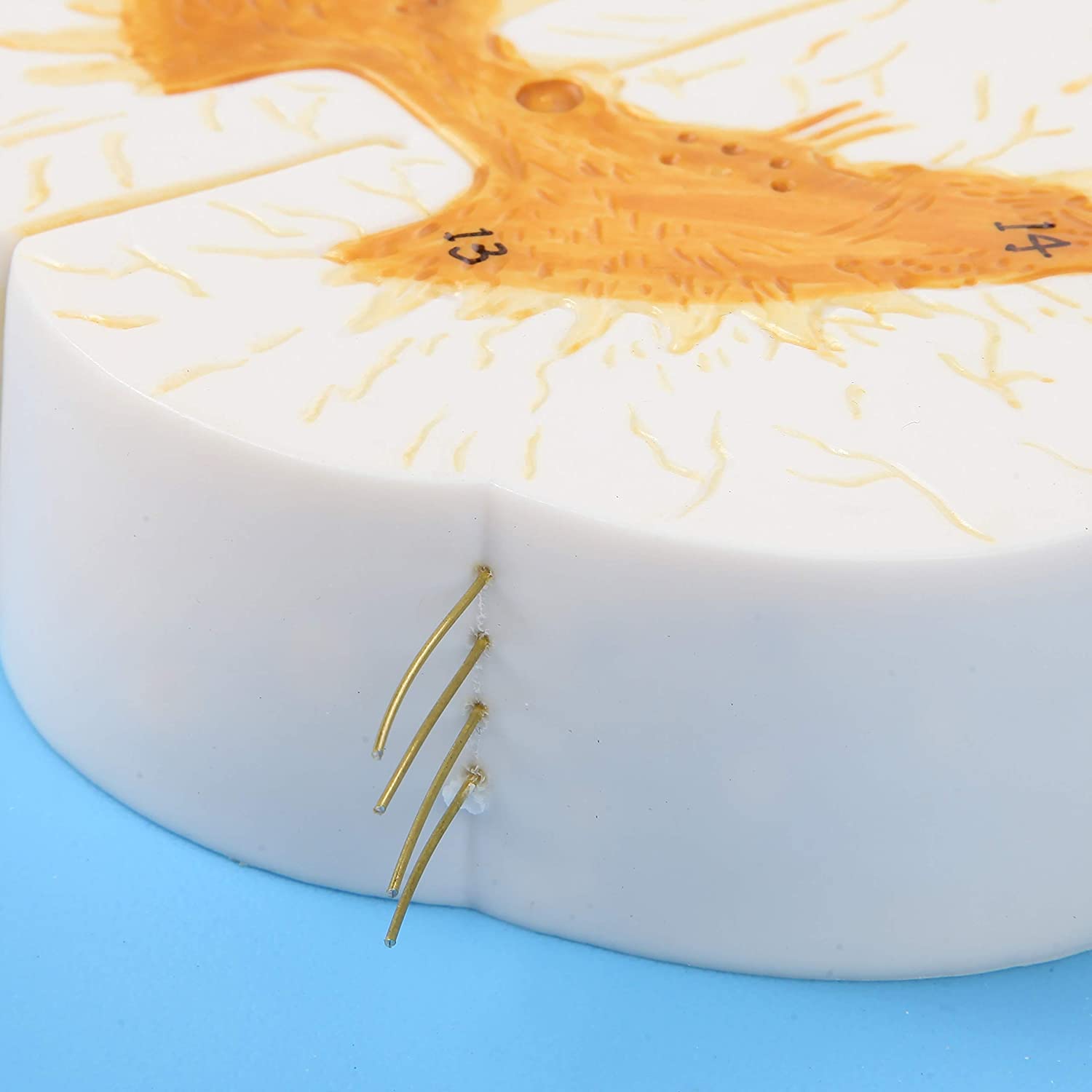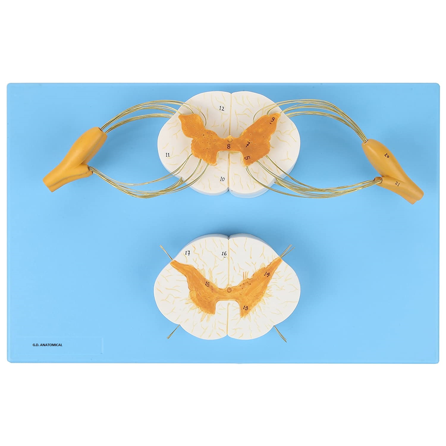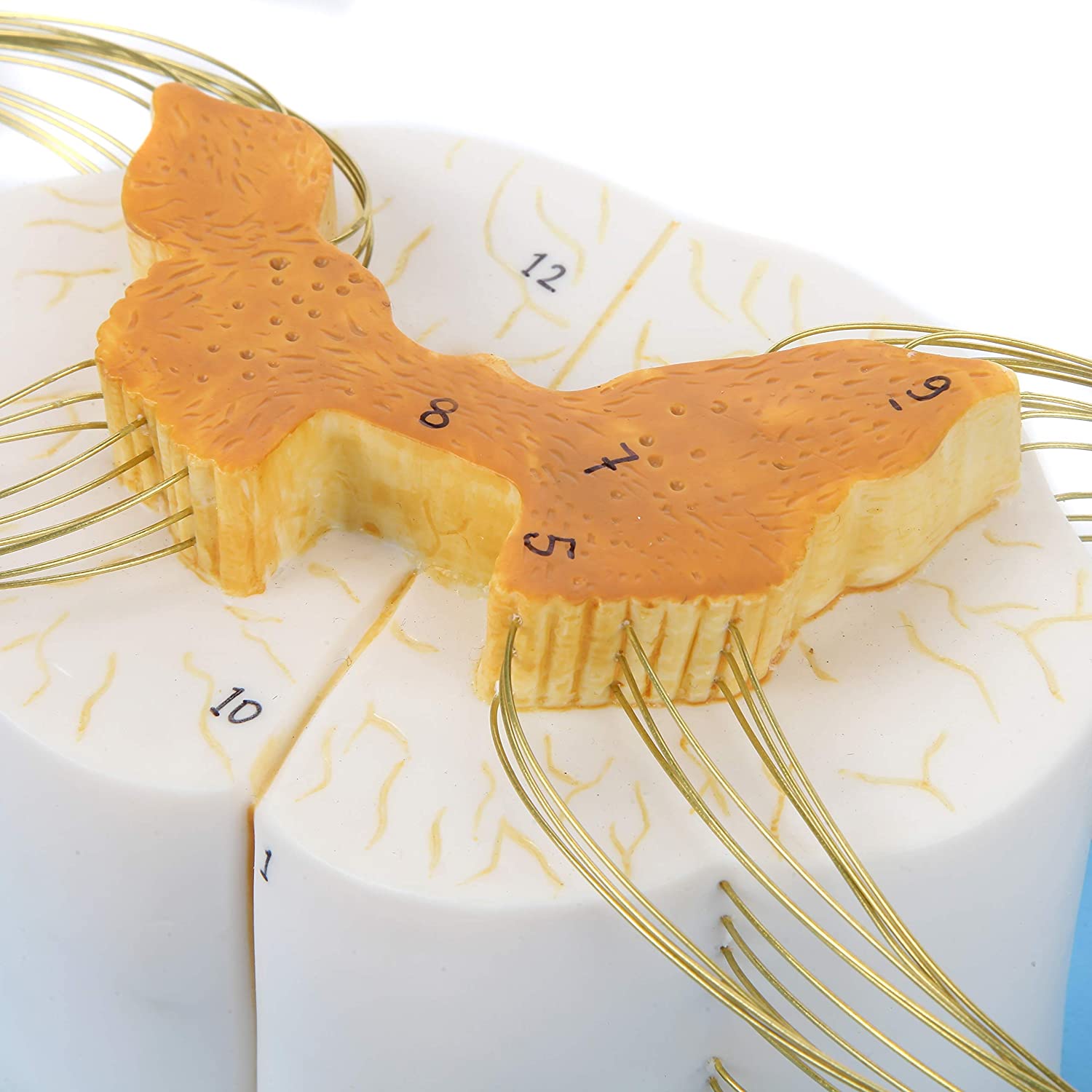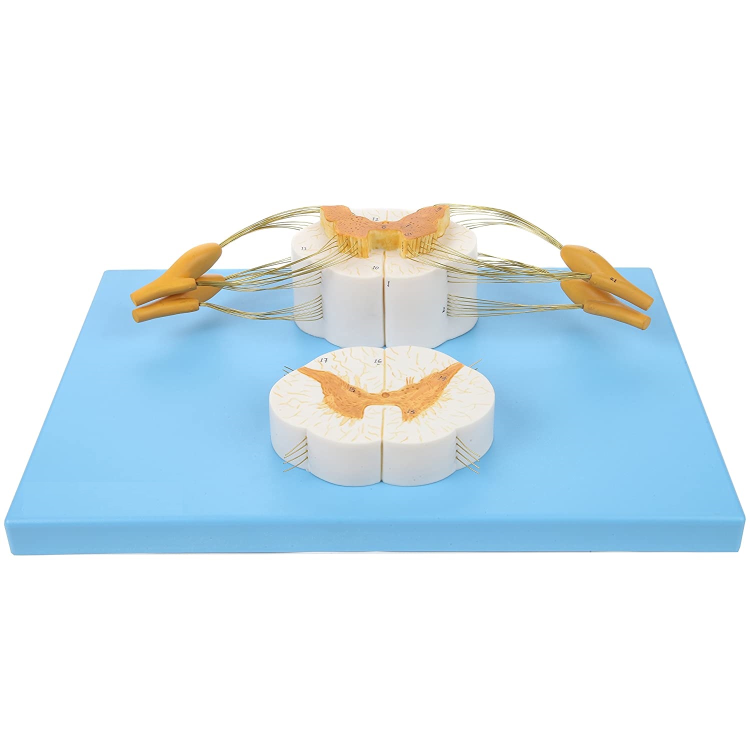8x Life Size Enlarged Model of the Spinal Cord: This human anatomy model of the spine shows the detail of the anterior and posterior nerve roots with additional depiction of the spinal ganglion. The model is displayed both longitudinally and in cross section for more in depth learning.