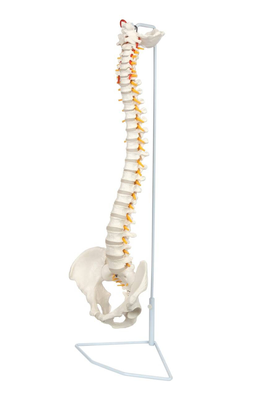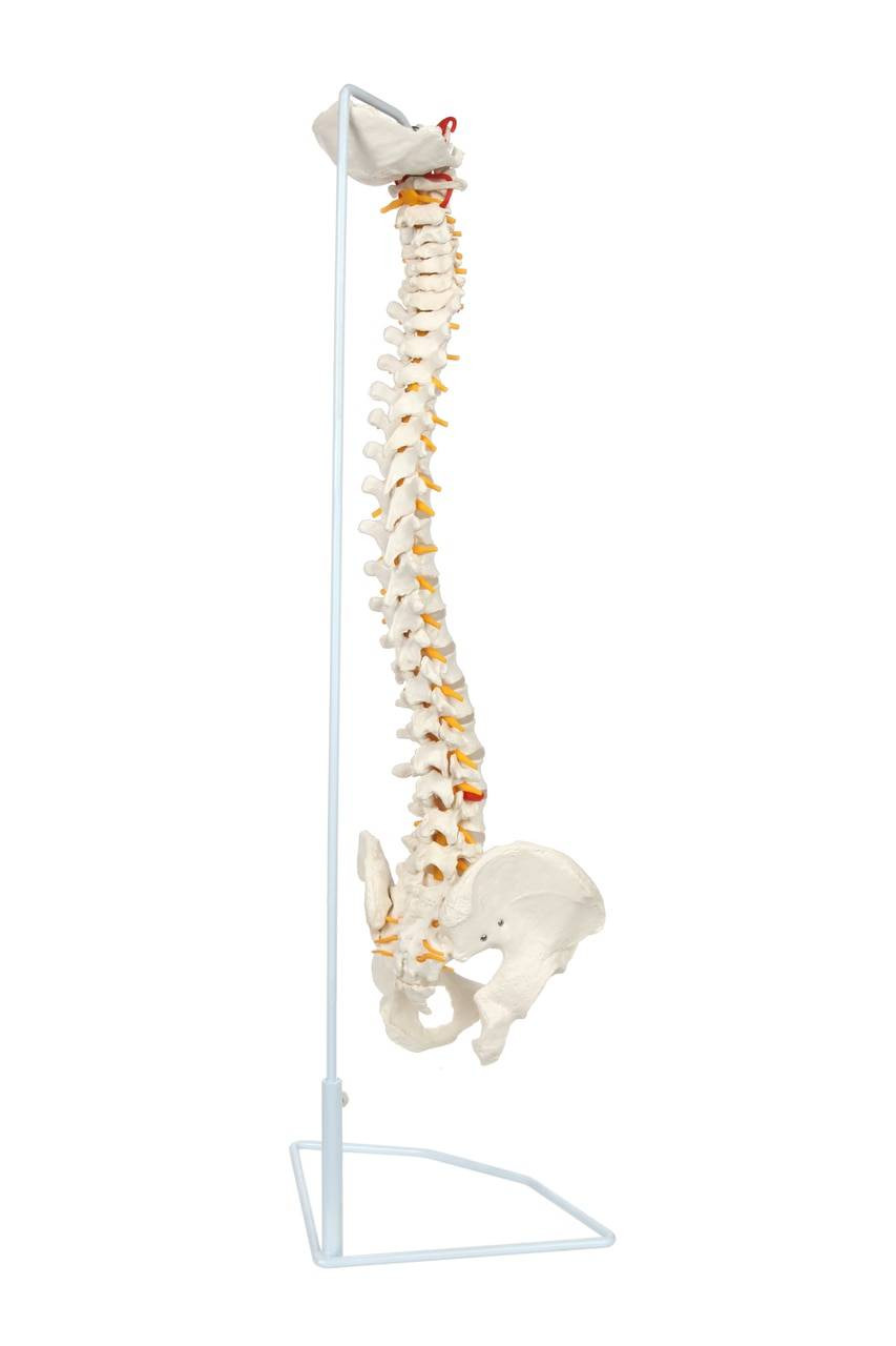 Mounted on a hanging stand, this spine model is life-size and remains static for uninterrupted anatomical study. Our complete vertebral column model begins at the occipital bone (base of the skull) and continues to the start of the cervical vertebrae with both the atlas and axis bones present.